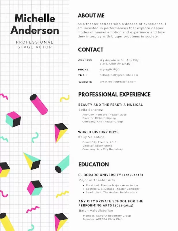 On mise ici sur le graphisme et les symboles pour dynamiser le CV. Attention toutefois de ne pas nuire à votre candidature avec des couleurs trop franches ou des motifs enfantins, qui risquent de miner votre crédibilité. Assurez-vous aussi que le recruteur puisse retrouver facilement les informations les plus importantes.