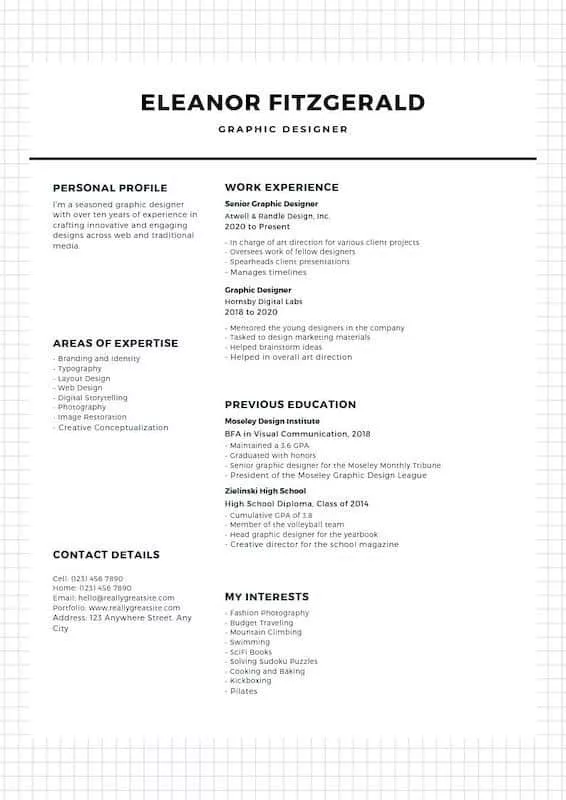 Ce CV consiste à diviser la page en deux colonnes : la première pour les diplômes, formations, certificats et compétences, et la seconde pour l’expérience professionnelle. L’avantage tient à ce qu’aucune information ne prend le pas sur les autres. Évitez quand même de surcharger le CV d’information!