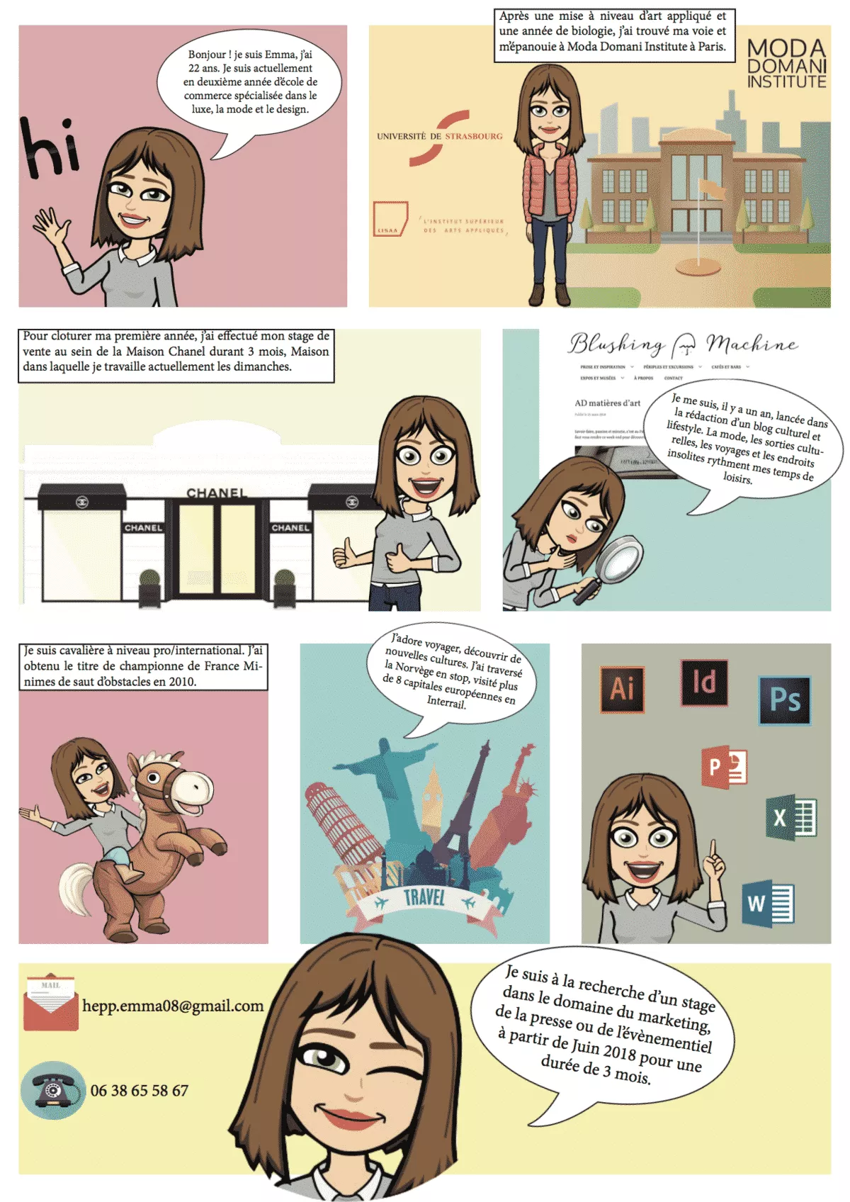 Vous êtes dans le domaine du visuel et vous savez manier le crayon? Parlez de vous en bande dessinée, comme un BR-reportage! Celui-ci a été réalisé avec les Bitmojis. Mignon, mais éculé. Pour plus d’originalité, tentez vous-même l’illustration.